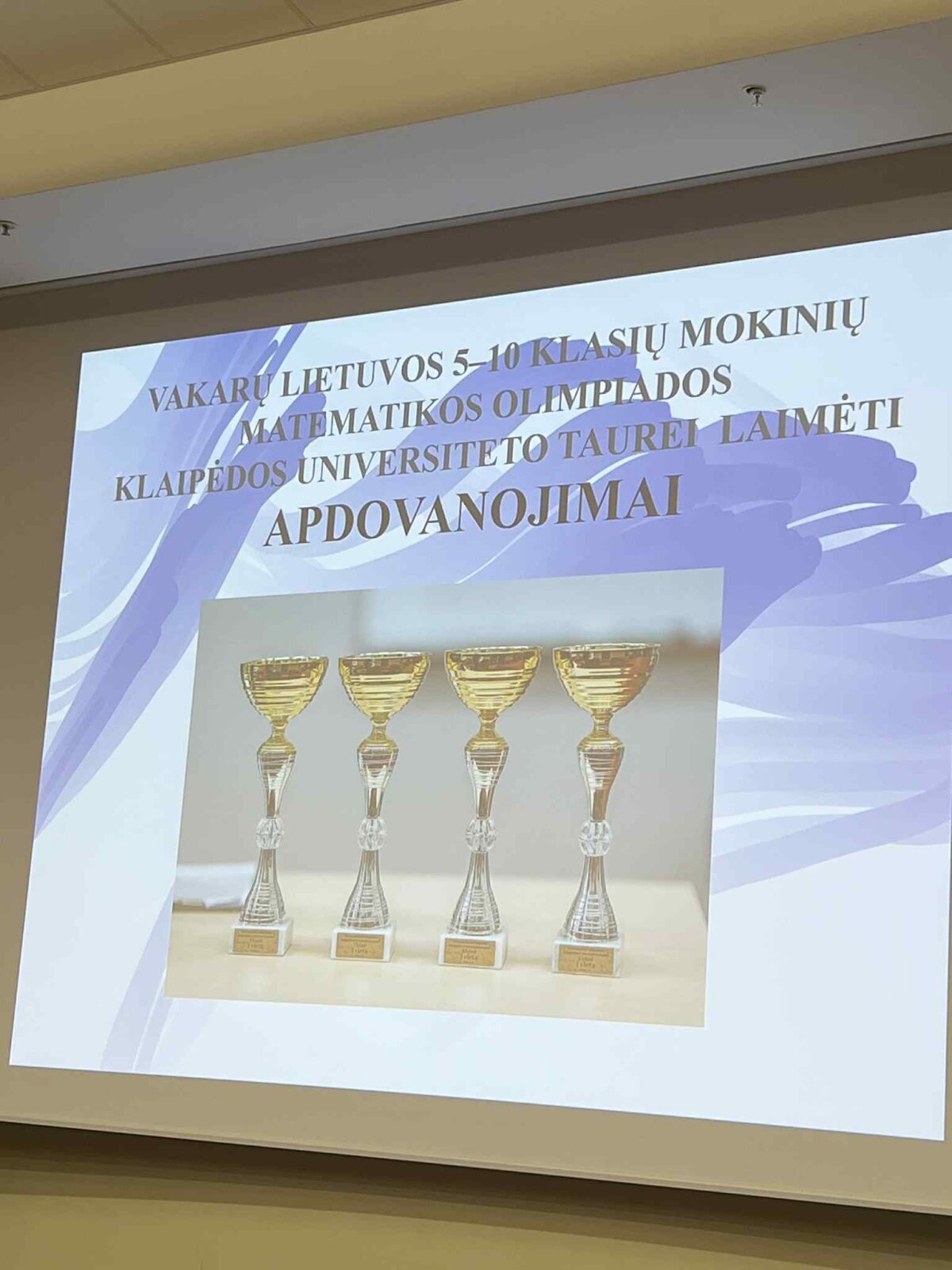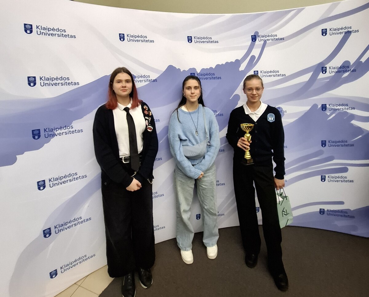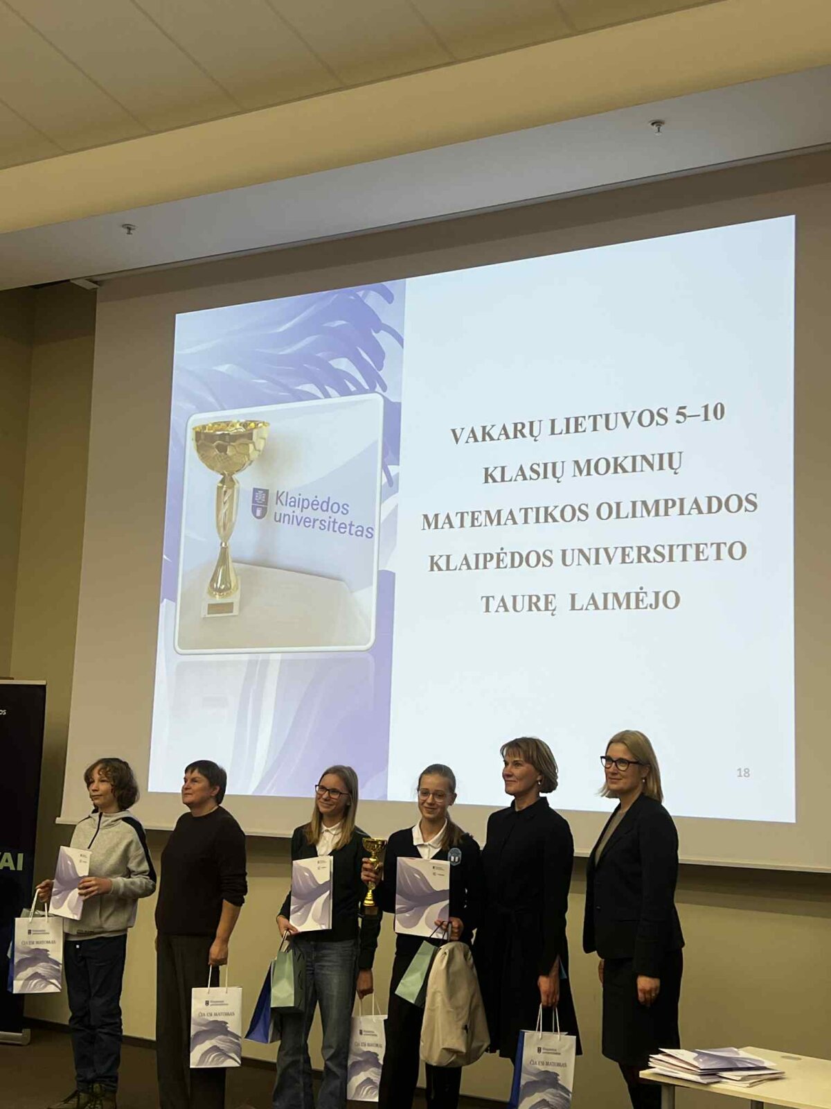 Lapkričio 21 d. Klaipėdos universitete vyko 5–10 klasių Vakarų Lietuvos regiono matematikos olimpiada, į kurią atvyko mokiniai net iš 12 savivaldybių. Į šį renginį buvo pakviestos ir mūsų mokyklos mokinės: Alisija Sliževskaja (6a kl.), Izabelė Mikaitė (7b kl.) ir Vladislava Romanenkova (8b kl.).