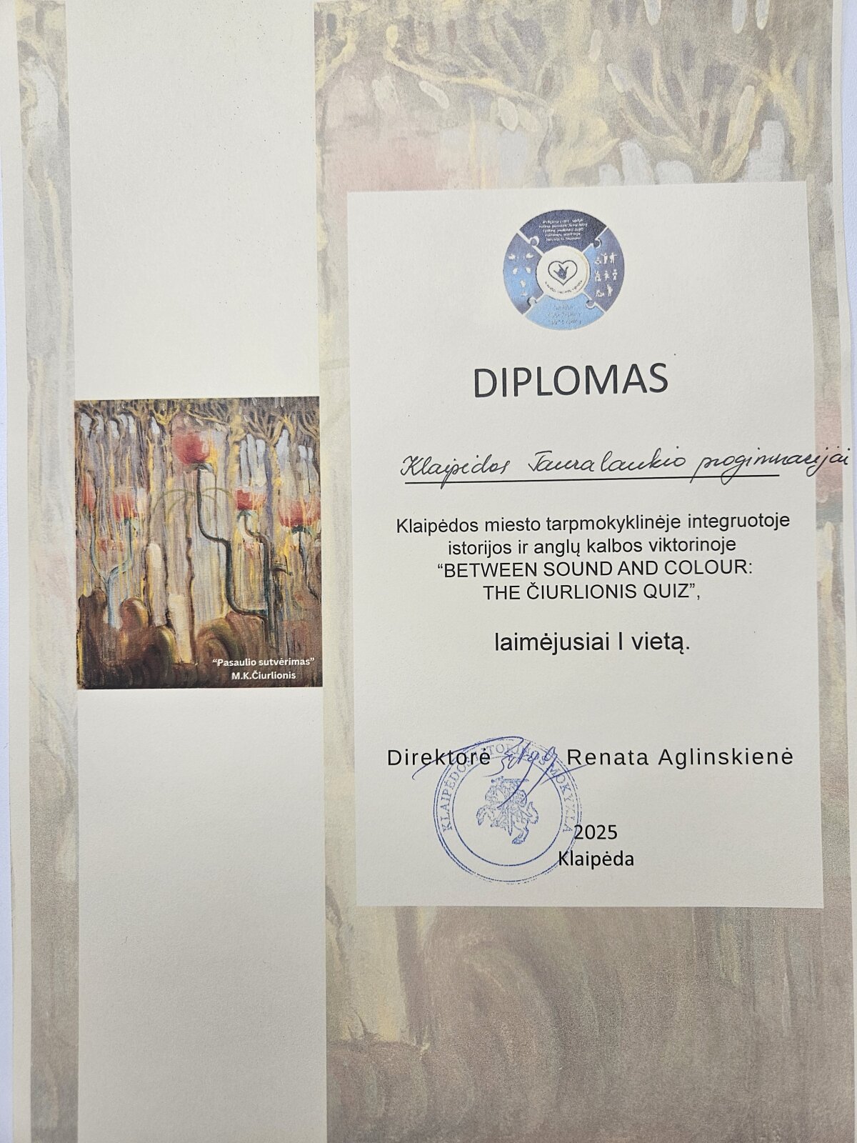 I-oji vieta Klaipėdos miesto 7-8 klasių mokinių viktorinoje "BETWEEN SOUND AND COLOUR: THE ČIURLIONIS QUIZ"