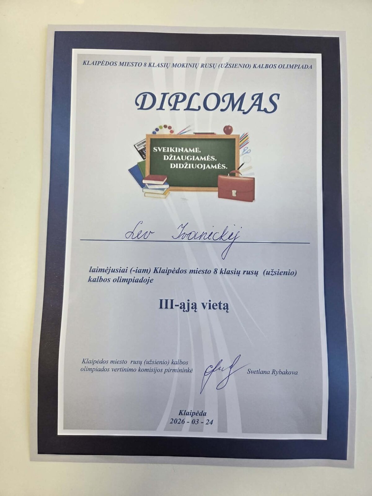Laimėta III vieta Klaipėdos rusų (antrosios) užsienio kalbos olimpiadoje