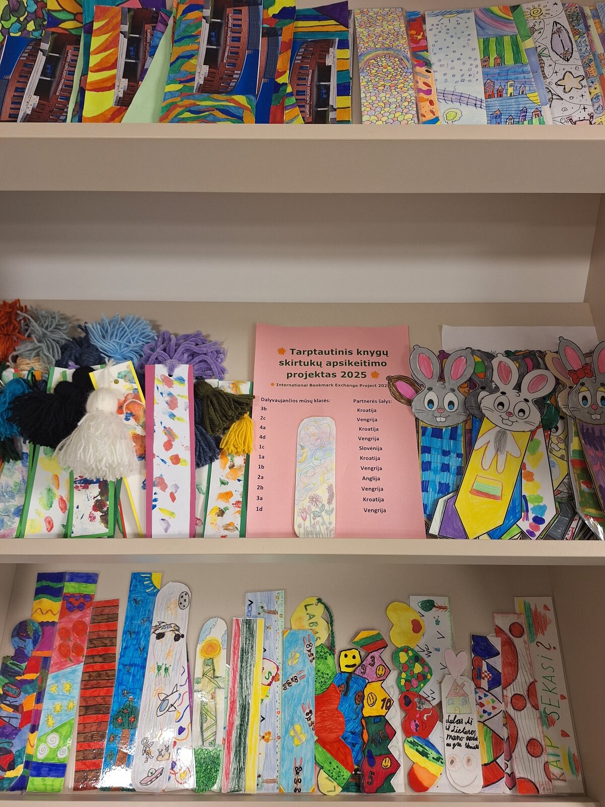 Spalio ir lapkričio mėnesiais mūsų mokyklos biblioteka dalyvavo tarptautiniame knygų skirtukų apsikeitimo projekte, skirtame skatinti mokinių skaitymą, kurti tarpkultūrinius ryšius ir ugdyti kūrybiškumą. Į projektą aktyviai įsitraukė net 11 pradinių klasių. Šiame projekte dalyvauja daugybė mokyklų iš įvairių pasaulio šalių, o partneres mokykloms parenka projekto organizatoriai (International Association of School Librarianship). Šiais metais mūsų mokyklai buvo paskirtos partnerės mokyklos, esančios skirtinguose Kroatijos, Vengrijos, Slovėnijos ir Anglijos miestuose. Mokiniai kūrė knygų skirtukus laisva forma – rinkosi savas idėjas, technikas ir spalvas. Baigti darbai buvo išsiųsti paštu į partnerių šalis, o mes patys su nekantrumu laukiame skirtukų, kuriuos mokiniai gaus mainais. Jau kelios klasės sulaukė pirmųjų siuntinių ir džiaugiasi gautomis dovanėlėmis bei galimybe susipažinti su bendraamžių kūryba iš kitų šalių.