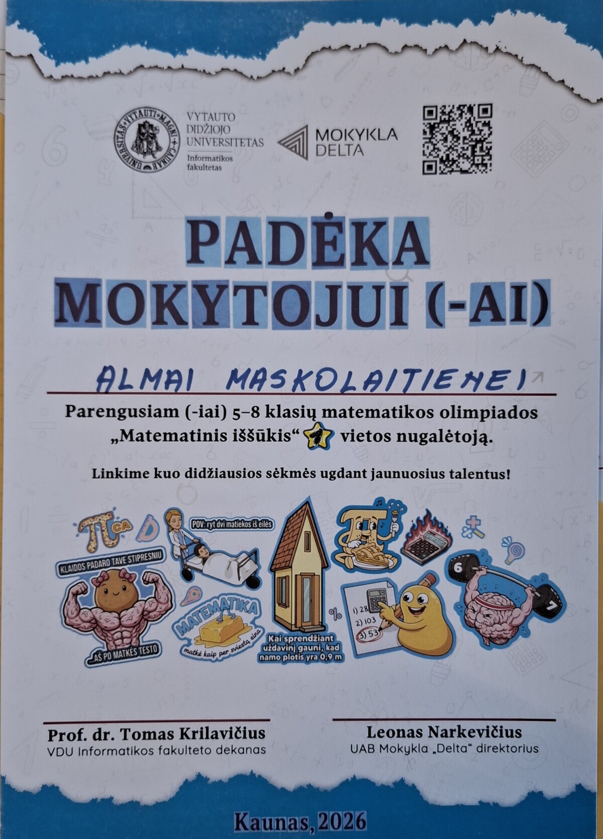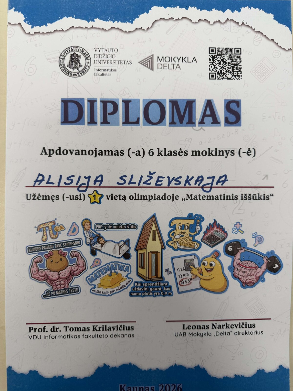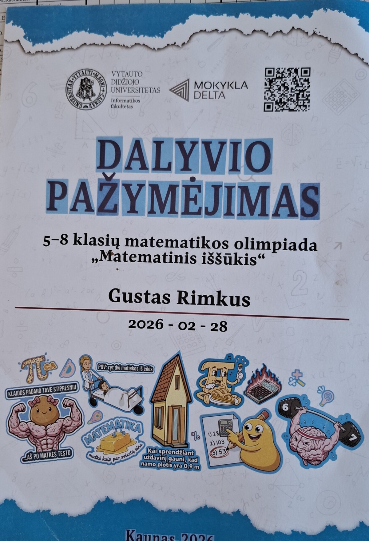 Vasario 28 d. Vytauto Didžiojo universiteto Informatikos fakultetas vyko 5–8 klasių mokiniams skirta matematikos olimpiada „Matematinis iššūkis“. Renginyje dalyvavo mūsų mokyklos 6a klasės mokiniai Alisija Sliževskaja ir Gustas Rimkus.