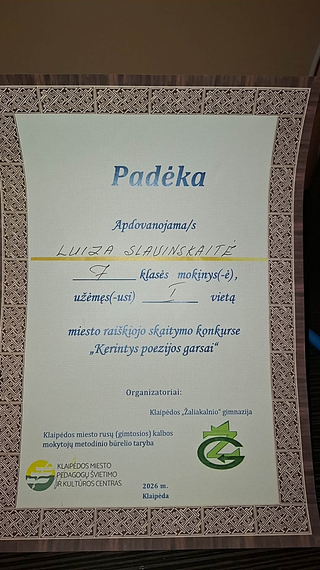 Kovo 13 Klaipėdos „Žaliakalnio“ gimnazijoje vyko tradicinis Klaipėdos miesto rusų kalbos raiškiojo skaitymo konkursas „Kerintys poezijos posmai“. Konkurse puikiai pasirodė progimnazijos mokinės II vietą užėmė 6b klasės mokinė Evelina Bungaitė, I vietą 7b klasės mokinė Luiza Slavinskaitė.